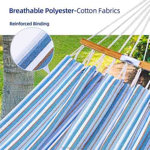 Moreover, their moisture resistance isn’t the greatest, and nowadays, you rarely see pure cotton hammocks without the addition of polyester fibers to enhance moisture resistance.